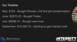 We officially started Integrity Junk Removal and Demolition on May 17, 2021. At first, we had no website, no truck, and no equipment. Our first job—done with a rented trailer—brought in $160. This proved the concept and gave us a starting point.
