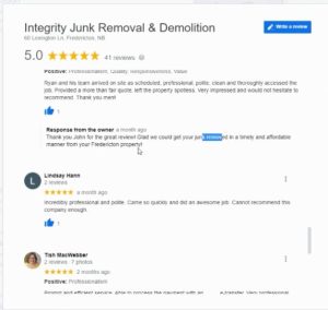 Our responses to reviews incorporated keywords. For example, if a client said we removed a shed, we’d reply: