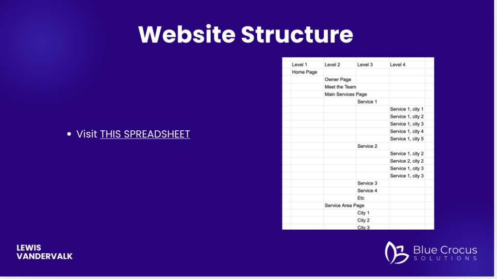 Keep your URLs clean and no more than 3–4 levels deep. Make each page unique, with location-specific info, images, and testimonials.