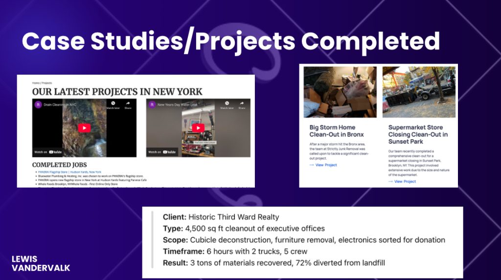 Google doesn’t rank websites. It ranks pages. So stop saying “I do junk removal” and start showing: