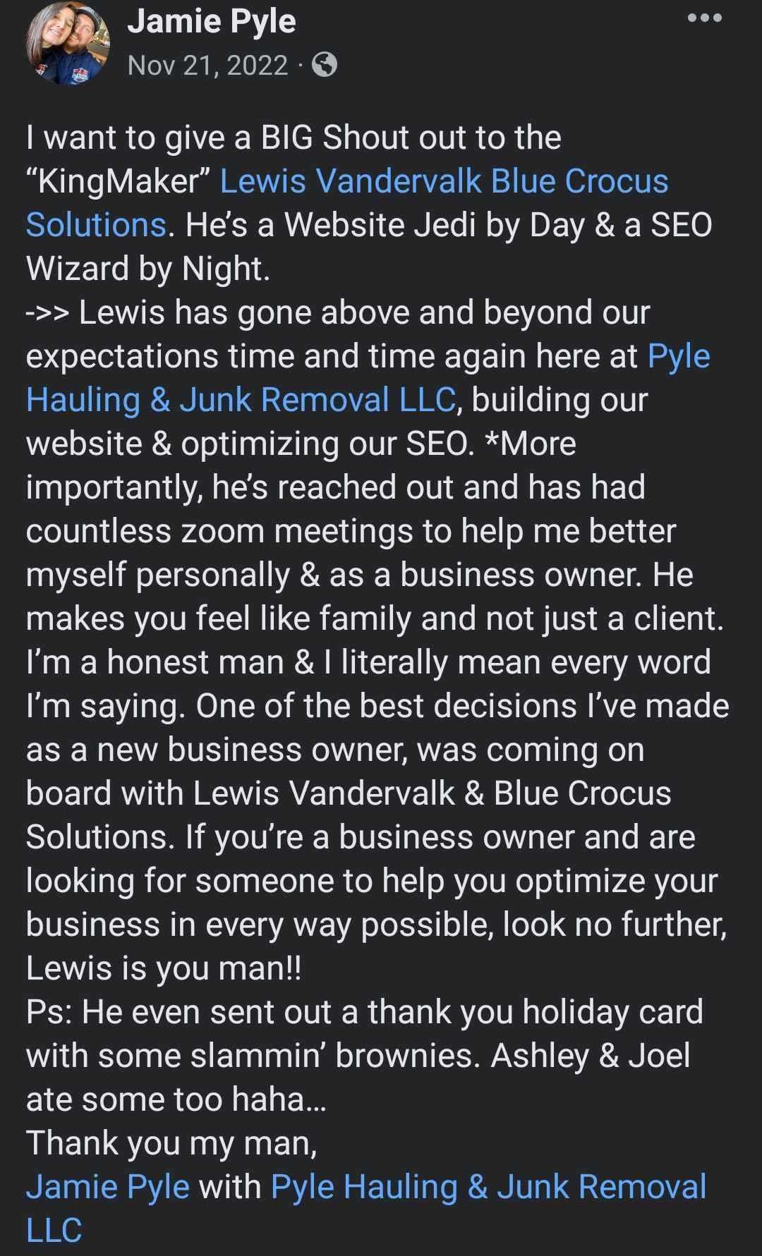 Lewis, and the rest of the Blue Crocus Solutions team are the best of the best at what they do. They go above and beyond for their customers. I couldn't have asked for a better website, or logo than the ones they built for me. Not only did I make a working relationship, I made a friend. Lewis always checks in every so often to make sure everything is going well. You can tell they care about people first. I would recommend Blue Crocus Solutions to anyone wanting a top tier website, or logo.